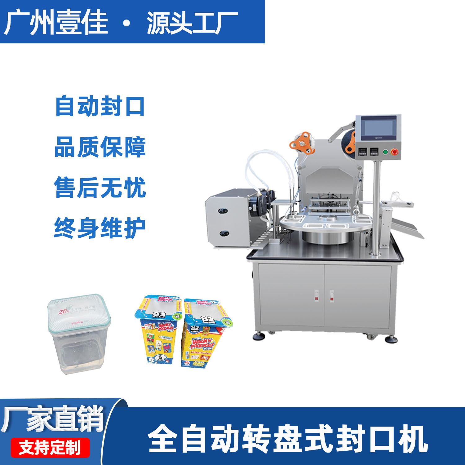 伺服驱动,光纤精准定位,切边小,机器可快速稳定运行,适用 PLC及人机界面操作系统,各项参数设定直观精美, 操作便捷。连续式输送、封口及输出,二次热封,封口性能优越,可接流水线,生产高效、适用性广。可配置日期打码,可 配置定量灌装系统(液体/膏体/粉末),形成灌装加封口一体组合。